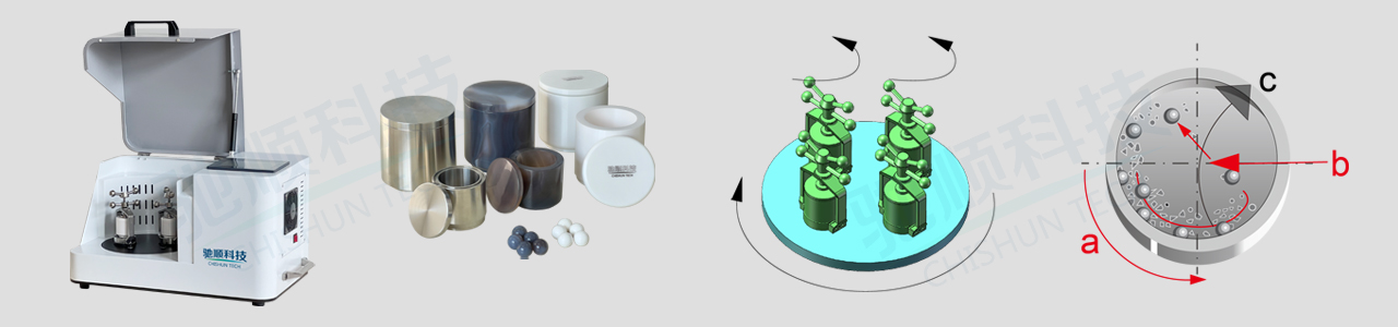 材料的粉碎和研磨主要是通过磨球之间的高速摩擦和碰撞实现。当大盘旋转时,装有样本材料和磨球的研磨罐,围绕自身的中心轴向反方向进行高速自转。在一定的速度下,离心力使得罐底的样本和磨球与研磨罐内壁发生分离。磨球在罐内高速穿梭,通过撞击罐壁进一步对样本进行研磨。此外,磨球之间的冲击碰撞也加速了对样本尺寸的消耗。PULVERIZER 500四罐高能行星式球磨机太阳轮主盘的转速高达400rpm,研磨罐自转达870rpm以上,离心力高达22g。